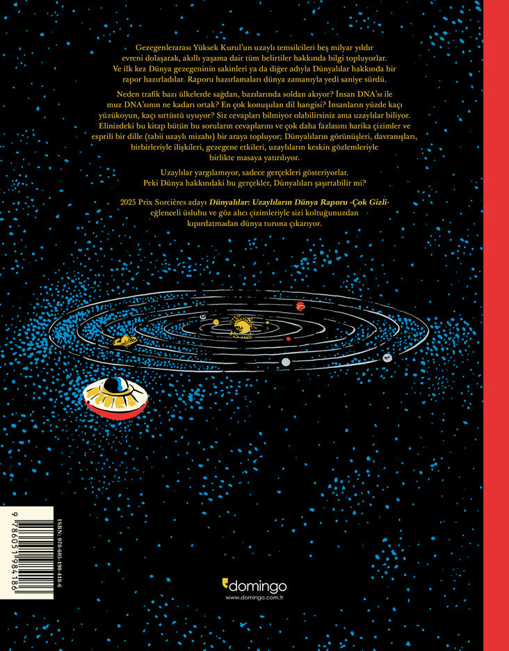 Neden trafik bazı ülkelerde sağdan, bazılarında soldan akıyor? İnsan DNA’sı ile muz DNA’sının ne kadarı ortak? En çok konuşulan dil hangisi? İnsanların yüzde kaçı yüzükoyun, kaçı sırtüstü uyuyor? Siz cevapları bilmiyor olabilirsiniz ama uzaylılar biliyor. Elinizdeki bu kitap bütün bu soruların cevaplarını ve çok daha fazlasını harika çizimler ve esprili bir dille (tabii uzaylı mizahı) bir araya topluyor; Dünyalıların görünüşleri, davranışları, birbirleriyle ilişkileri, gezegene etkileri, uzaylıların keskin gözlemleriyle birlikte masaya yatırılıyor.