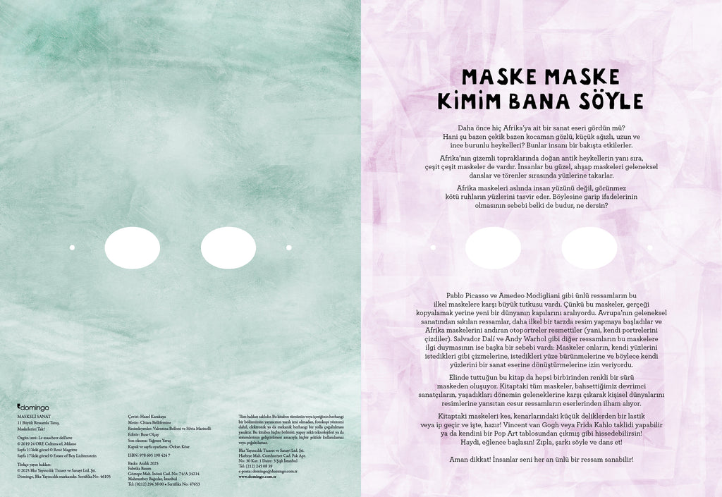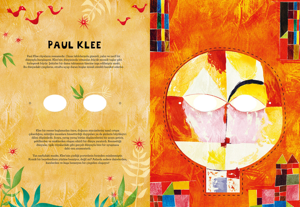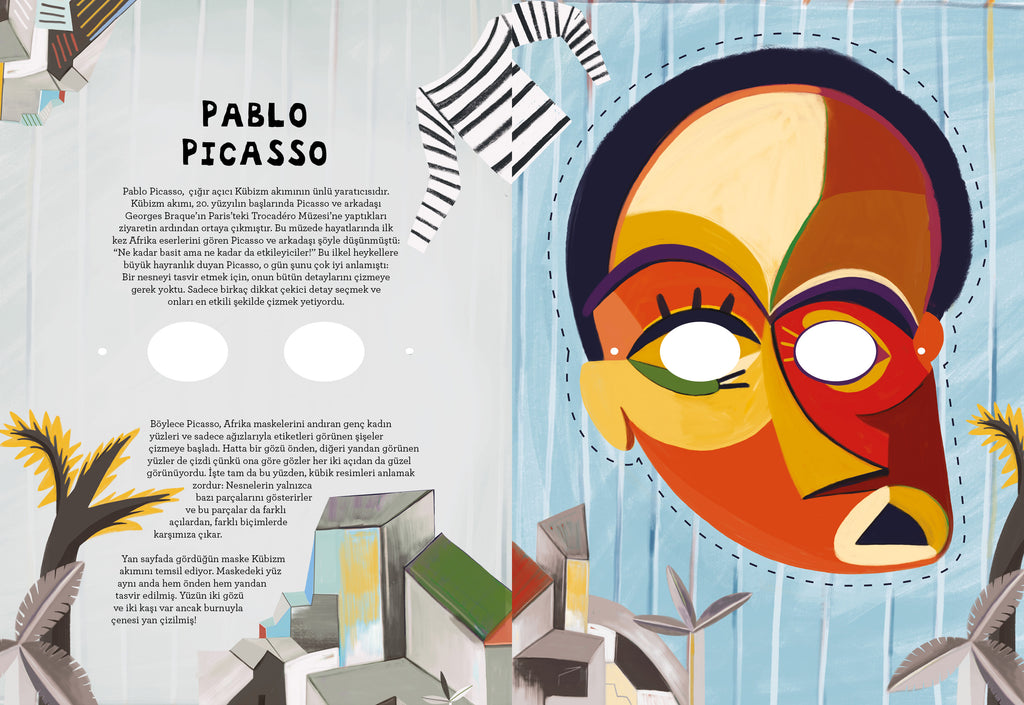 Tasarımından boyutuna göz alıcı olan bu kitap çocukları modern sanatla tanıştırmanın belki de en eğlenceli yolu! Bir sayfada Picasso’dan Dali’ye, Frida’dan Modigliani’ye on bir büyük ressam hakkında kolay anlaşılır bilgiler, diğer sayfada ise onların çizdikleri maskeler. Bu oyun-kitapla çocuklar bir yandan sanatçılar hakkında temel bilgileri öğrenecek diğer yandan da maskeleri takıp birer sanat eserine dönüşerek çok eğlenecekler.
