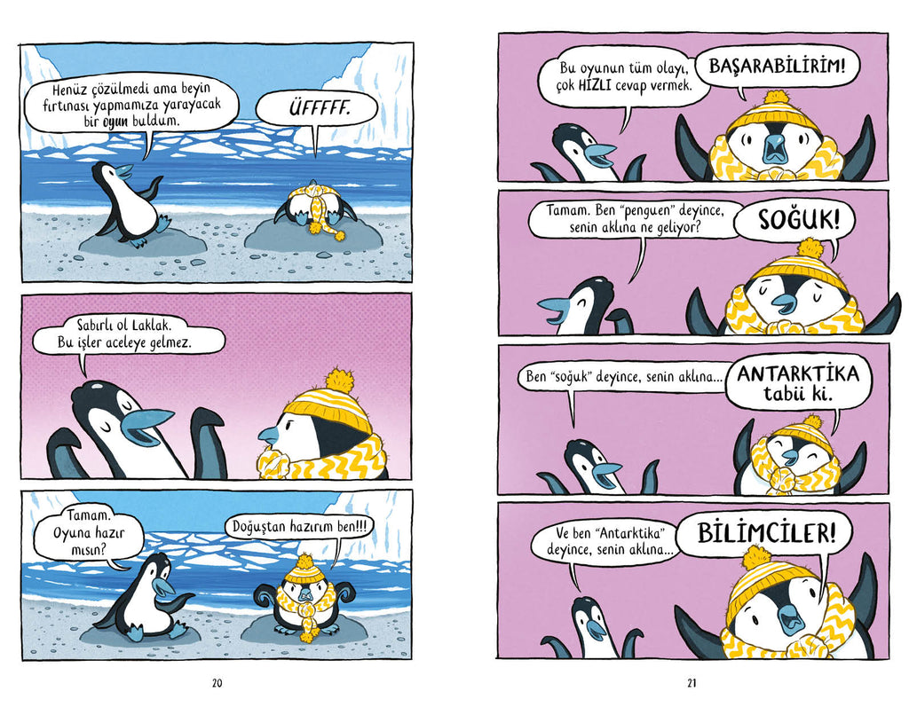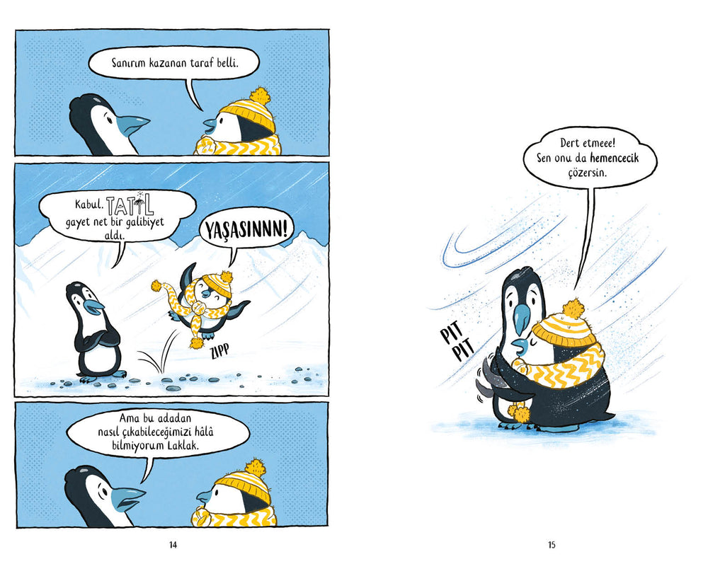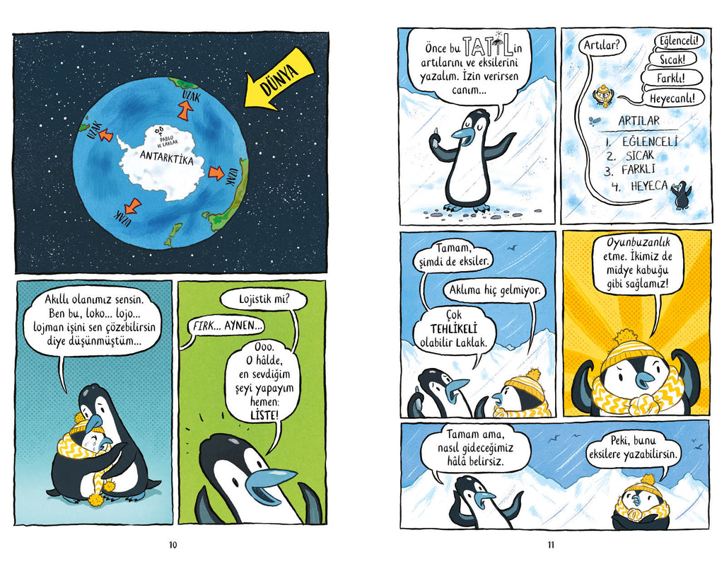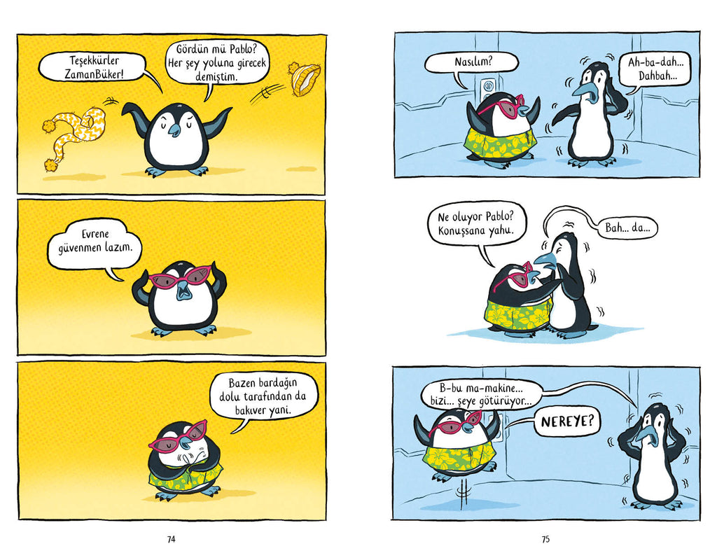 Antarktika’da yaşayan penguenler Pablo ile Laklak hem kankalar hem de iki ayrı kutuplar! Pablo buz gibi serin yuvasından memnun, Laklak ise tir tir titremekten çok sıkılmış, soğuktan uzaklaşıp güneşli bir kumsalda TATİL yapmak istiyor. Peki penguenseniz yani uçamıyorsanız ve sıcak denizler yüzerek varamayacak kadar uzaksa, nasıl tatile gidebilirsiniz? İki kafadar kara kara ne yapacaklarını düşünürken karşılarına Profesör Zekiye çıkıyor ve sonra… Sonra mı?! İşte karşınızda dünyanın ilk ZAMAN YOLCUSU PENGUENLERİ!
