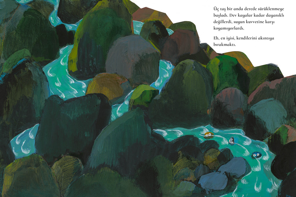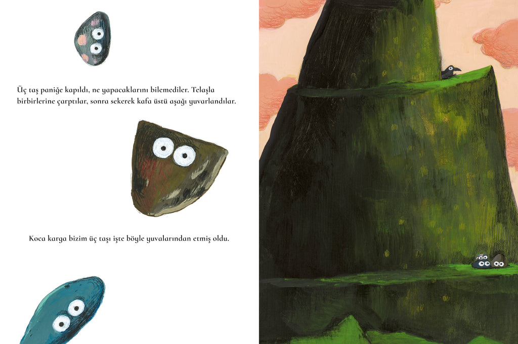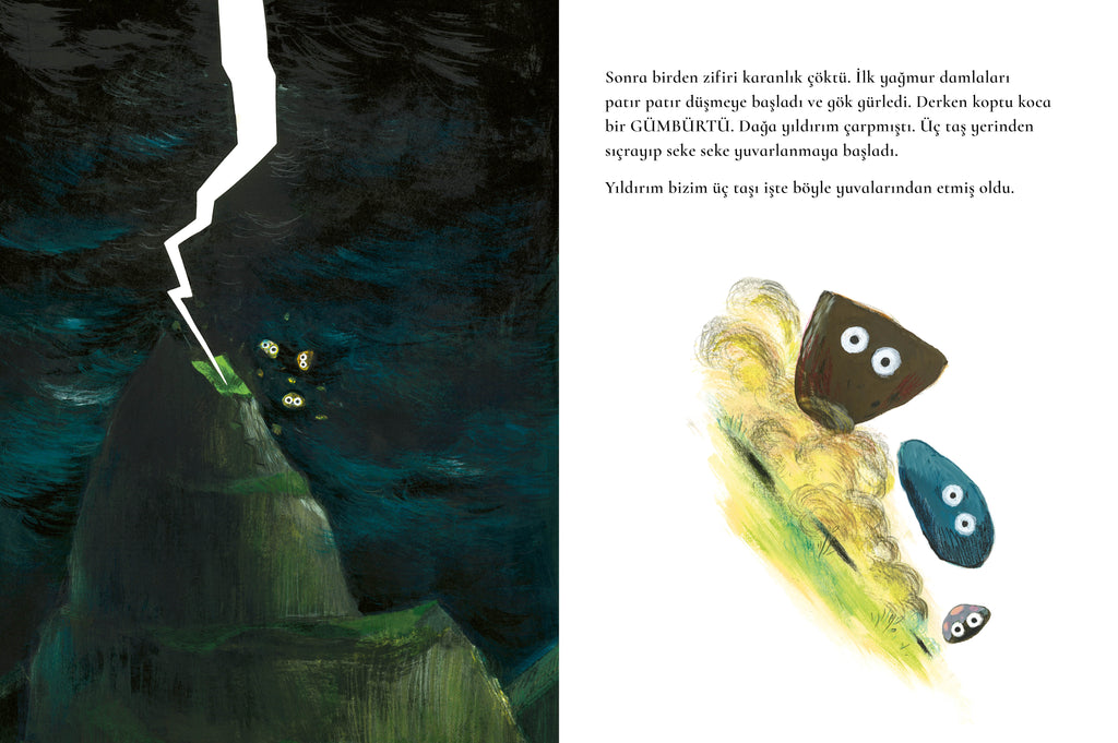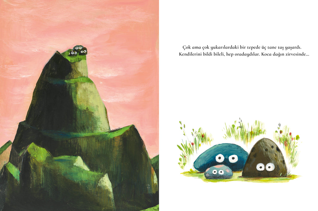 Koca dağın zirvesinde, üç taş yaşıyordu. Kendilerini bildiklerinden beri oradaydılar. Birbirine benzerdi günleri ama mutluydular. Ancak bir gün… GÜMBÜRRR! Yuvalarına yıldırım çarptı ve üç taş aşağı doğru yuvarlanmaya başladı. Yuvarlandılar oradan oraya, değişti manzara, değişti komşular, çok şey değişti ama onlar her seferinde sevecek yeni bir şey buldular.